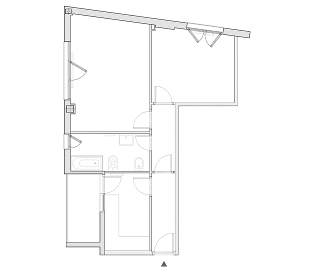 De la misma manera, la superficie destinada a albergar el baño se percibía como excesiva; por ello se plantea un leve movimiento en la tabiquería existente que nos permite aumentar la superficie útil de la cocina y proporcionar la del baño.