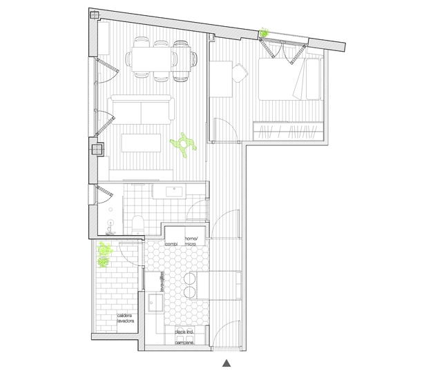 Se propone una intervención que busca optimizar el espacio existente concentrando la compatibilidad de usos programáticos. Para ello, se condensa el pasillo de acceso a la vivienda y la cocina en un único espacio que hace las veces de recibidor, cocina, comedor de diario (isla) y distribuidor.